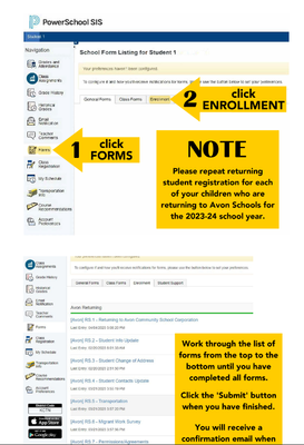 https://avonin.powerschool.com, tiene que meterse ahi a su cuenta de powerschool , y luego buscar donde dice FORMS, y de ahi enrollments..