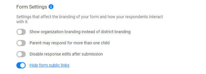 By default, when a form is published, public links are generated for the district as well as all organizations the form is enabled for. When this is enabled, only the URL for the district is shown.