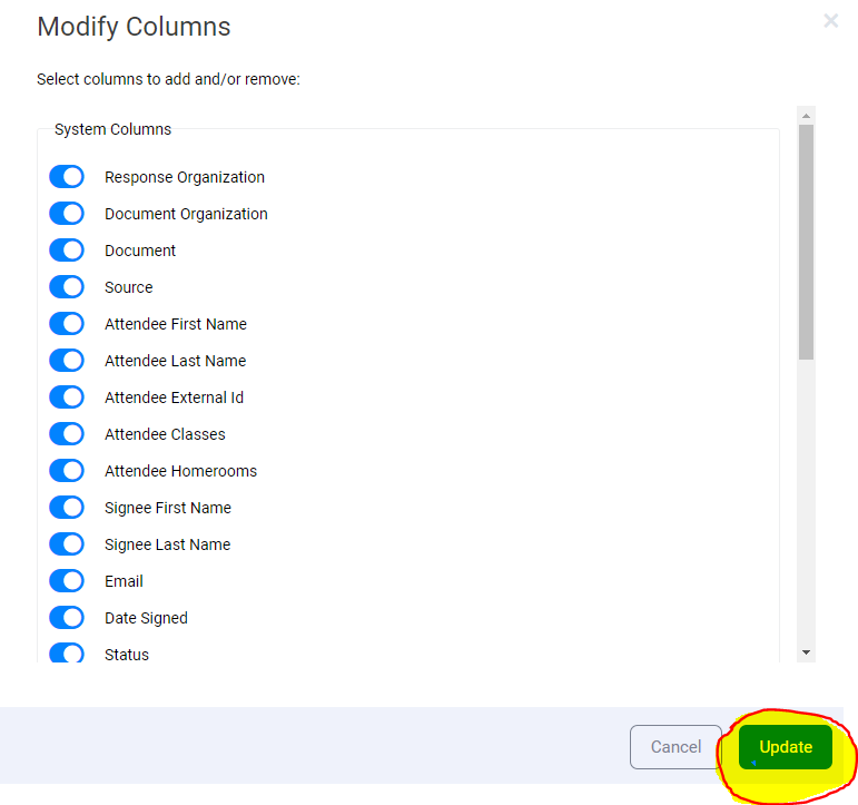 - Click on Update once you have selected the columns that you want in your report.