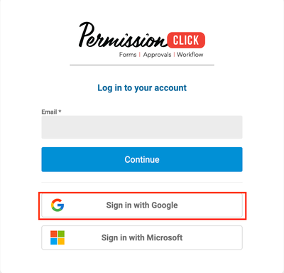 - Users with Permission Click account linked with Google, would use the “Sign in with Google” option. The users would be redirected to Google login page and would be allowed to login to Permission Click by providing the correct username and password combination.