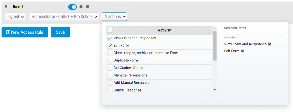 Access & Visibility provides the ability to manage a form’s access and permissions. This allows you to create a rule and grant or deny which organizations, users, or roles can have access and assign what actions or functions they can perform e.g. View, Edit, Duplicate, etc.