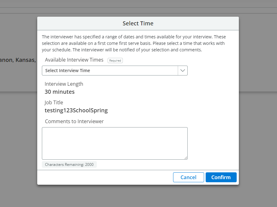 If after clicking 'Interview' you get taken straight to page with your interview information be sure to 'Select Time' to schedule the interview or 'Decline' if you so wish to. After selecting your time from the 'Available Interview Times' dropdown click 'Confirm'.